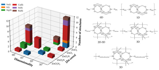 The results of the CSD search are summarized in Figure 2 and the SI (Table S3). It was observed that 19 structures showed a central Ca(II) ion, followed by Mg(II) displaying 5 hits, Na(I) with 4 hits, Sr(II) and Ba(II) both presenting 3 hits, and K(I) containing 1 hit. Furthermore, complexes displaying 0D (11 hits) and 3D (14 hits) structures were more abundant than 1D or 2D CPs (both presenting 5 hits). Of note, the central s-block metal ions were located in octahedral O-based pockets in almost every structure, except for three examples containing Sr(II) or Ba(II), whose bigger ionic radii allowed the expansion of the coordination sphere reaching [SrO8]/[BaO8] cores [15,57,58]. Otherwise, the coordination sphere of the lateral Zn(II) ions showed diverse coordination pockets, displaying [ZnO4] (15 hits), [ZnO5] (1 hit), [ZnO3N] (13 hits), [ZnO4N] (4 hits), and [ZnO3N2] (2 hits) cores. However, the five-coordinated environments were relatively scarce, being mainly originated from μ2-η2: η1 carboxylate coordination modes [22,56,59,60], the coordination of water molecules [61,62], or by μ2-η2 ditopic oxygen atoms from carboxylate moieties [63] (SI: Figure S8). Regarding the tetrahedral pockets, the two cores found differed in their lateral position, which could be either a N- or an O-atom. In 12 structures presenting [ZnO3N] cores, the N-atoms arose from pyridine or bipyridine ligands displaying 0D or 1D complexes, such as in 1C. At the same time, there was a unique case where 2D sheets were formed by the expansion of a dicarboxylate ligand [64]. Conversely, all the structures with [ZnO4] cores displayed 2D or 3D arrays, showing mostly solvent molecules coordinated to their apical positions, while only in three examples the molecular expansion was done by both the carboxylates forming the SBU and those located in their apical positions [15,54,65]. Therefore, this overview showed that while the investigation regarding heterometallic complexes with [Zn2M] (M = s-block metal ion) pinwheel SBUs has been scarce, it offers a great structural variability toward the formation of heterometallic arrays which are completely modulable, as it is possible to extend their structures through their apical positions or their central ligands either by bipyridines, carboxylates, or both. However, this compilation shows that further investigation about this SBU needs to be carried out to control the obtained structures.