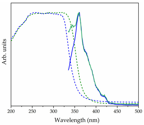 The solid-state UV-Vis and photoluminescence of 1 and [Zn3(ACA)6(4-phpy)2] was recorded (Figure 3). The absorption spectra of both compounds showed similar profiles, presenting a broad unstructured signal with a maximum between 240 and 323 nm (1), and 240 and 330 nm ([Zn3(ACA)6(4-phpy)2]). When irradiated at an excitation wavelength of 320 nm, both compounds showed one unstructured signal with its maxima centered at 360 nm and a Stokes shift of 3472 cm−1, suggesting local electronic transitions which have been tentatively attributed to intra-ligand charge transfers (ILCT) of either the ACA or the 4-phpy ligands [66,67]. The comparison between the two compounds showed that they only present minimal differences between their emission profiles. In addition, the resultant emission color for both compounds was blue for 1 and electric violet for the homometallic compound, according to the CIE 1931 chromaticity diagram (SI: Figure S9) [68]. Therefore, it was observed that the exchange of a Zn(II) for a Ca(II) in the central position of the pinwheel SBU did not confer significant differences to the photoluminescence properties of these complexes.