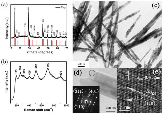 (a) XRD pattern (b) Raman spectra and (c) TEM image of as-prepared VO2(B) nanobelts at ambient conditions. (d) The selected belt for HRTEM. Insets: selected area electron diffraction of the circular region of a single VO2(B) nanobelt. The diffraction spots with arrows can be defined, respectively. (e) HRTEM image of the selected area from the selected nanobelt. The lines over the number represent the scale bar.