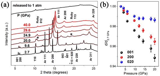 (a) XRD patterns of VO2(B) upon compression, the peaks of ruby are asterisked as *. (b) Pressure dependence of the d value of three selected peaks (001), (020) and (200) upon compression.
