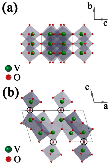 The crystal structure of VO2(B) is shown in Figure 3. There are two identical layers of atoms along b in a unit cell, the second layer is shifted with respect to the first one by 1/2, 1/2, 0, and VO6 octahedra are connected with each other by corners or edges. For the circled regions in Figure 3b, the large empty spaces are relatively easier to be compressed than the solid octahedra. On the other hand, the connection between corner-shared VO6 octahedra is much weaker than the connection between edge-shared VO6 octahedra. From the mechanical-stability point of view, breaking the connection of octahedra in the (010) plane is much easier than that in the (100) plane and the (001) plane [41]. Therefore, the coherence along the [010] direction may break first at a critical pressure.
