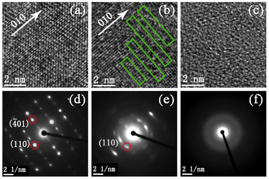 HRTEM images and SAED patterns of VO2(B) nanobelts from (a,d) pristine sample and recovered samples from (b,e) 15 GPa and (c,f) 30 GPa, respectively. Disorder regions are marked by rectangles. The diffraction spots with red circles can be defined, respectively.