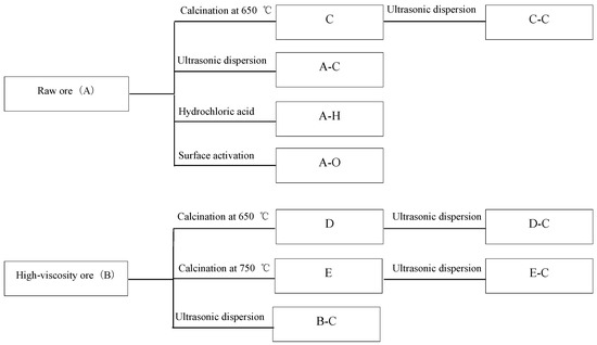 Raw ore (A) and high-viscosity ore (B) were selected as the raw materials, with the chemical activity improved by regulating the calcination temperature. The raw ore and high-viscosity ore that had been calcined at a temperature of 650 °C for 2 h were marked as C and D, respectively, whereas the high-viscosity ore that had been calcined at a temperature of 750 °C for 2 h was marked as E. The raw ore that had undergone hydrochloric acid modification was marked as A-H, whereas the raw ore that had been modified through surface bioactive treatment was marked as A-O. Ultrasonic dispersion was applied to the foresaid five types of NAC (A, B, C, D, and E), which were subsequently marked as A-C, B-C, C-C, D-C, and E-C, respectively. The sample numbers are shown in Figure 1.