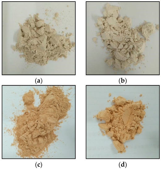 Appearance changes in raw ore and high-viscosity ore after calcination at 650 °C. (a) Raw ore; (b) High viscosity ore; (c) Calcined raw ore under 650 °C; (d) Calcined high viscosity ore under 650 °C.