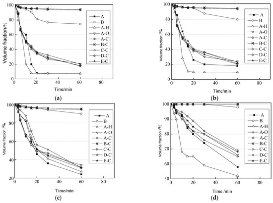 Relationship between settlement volume and time. (a) NAC addition: 1%; (b) NAC addition: 2%; (c) NAC addition: 3%; (d) NAC addition: 5%.
