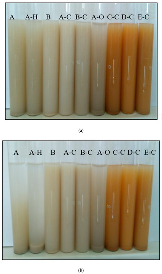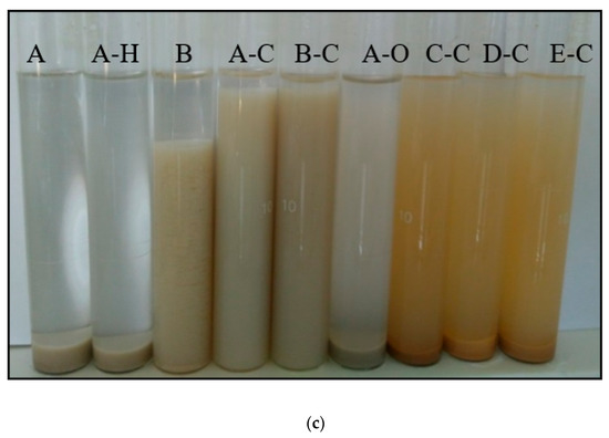 The turbid liquid of dispersed NAC was poured into a 25 mL colorimetric tube (shown in Figure 6). Figure 6 reveals that, when the mixing amount was at 1%, the acidified raw ore showed a slightly better effect than those unmodified. Although activated and calcined raw ores were inferior to acidified raw ore in dispersibility, they were much inferior to the raw ore and high-viscosity ore processed via ultrasonic dispersion. It is worth noting that adsorption aggregation is highly common in high-viscosity ore because of its high adsorbability. Therefore, when they agglomerated into floccules, the sediment volume was comparatively lowered.