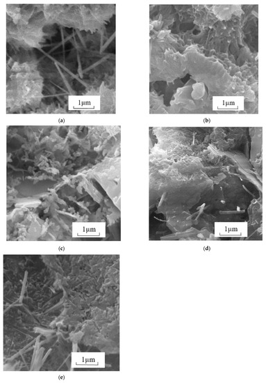 The microstructure of the cement with NAC under 650 °C calcinationis shown in Figure 7. According to Figure 7, the cement paste mixed with calcined NAC had a significantly higher compactness than pure cement paste, while pure cement paste showed larger gel pores as well as a less tight (weaker) bond between its hydration products. Figure 7 also reveals fibrous rods in the cement paste mixed with NAC, which had no bifurcations at the ends. Therefore, the impact of C-S-H gels was deemed insignificant. The early-strength Portland cement used in this test has a high C3A content, and NAC has a high aluminum content as well; as such, the two elements combined to cause a reduced stability in ettringites. Due to drying at a temperature of 75 °C for 24 h before electron microscopic scanning, most of the ettringites would have been decomposed by the heat if there were any. Moreover, the fluidity of the cement paste mixed with uncalcined NAC was not improved, thus indicating a poor performance of uncalcined NAC when integrating with the cement paste. Since no significant bunched ettringite crystals were observed in the cement paste, it was inferred that this kind of fibrous rod was NAC. It can be seen that the fibrous rods in b and c were significantly more compact than those in d and e. This was because the low activity of uncalcined NAC would prevent it from participating in the hydration process. Based on Figure 7, the cement paste mixed with uncalcined NAC contained a large amount of flocculent hydrated silicate gels after 28 d. The paste structure was relatively loose and not compact enough, showing numerous gel pores. However, the hydrated silicate gel mixed with calcined NAC had a compact structure with rod-like crystals tightly bonded with surrounding hydration products, thus indicating the significantly improved compactness of the paste.