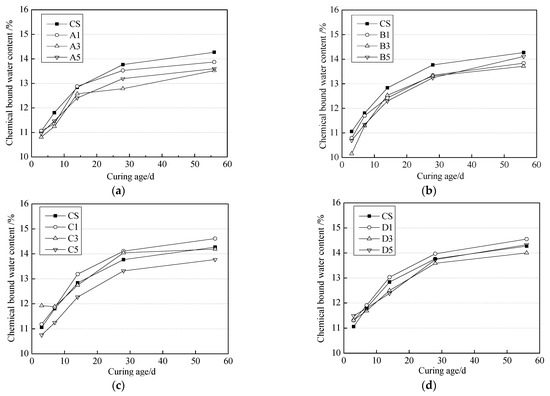 The chemical immobilized water content was tested when the test specimens were maintained at corresponding ages. The test results are shown in Figure 8. It can be seen that the chemically bound water content of the cement slurry increased rapidly in the early stage. Still, after 7 days of age, the growth trend of the chemically bound water content of each sample gradually slowed down, and the growth rate decreased. From Figure 8a,b at 3 days of age, we can obtain that the chemically bound water content in the cement with different ranges of the NAC raw ore (uncalcined) was 11.06%, 11.06%, 10.81%, and 10.97%. The chemically bound water content in cement mixed with high-viscosity ore (uncalcined) was 11.05%, 10.78%, 10.15%, and 10.69%. With the increase in the content, the uncalcined NAC reduces the hydration process of the cement. The chemically bound water content in the raw ore cement with the addition of 3% NAC is 12.78% at 28 days, and the chemical-bound water content in the high-viscosity ore cement is 13.31%, which indicates that the long-term activity of the raw ore is higher than that of the clay ore. From Figure 8c,d, it can be drawn that the movement of the calcined NAC has been improved. The chemically bound water contents in the 1% and 3% NAC raw (calcined) cement were 14.11% and 14.04%, which were higher than those in the NAC high-viscosity ore cement (13.96% and 13.58%). When the content of calcined NAC raw ore is 1%, the improvement effect on the cement hydration process is the best.