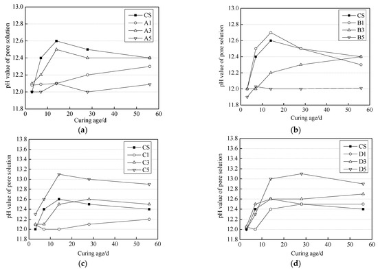 From Figure 9a,b, it can be seen that the pH value of the pore solution of the cement slurry mixed with uncalcined NAC is generally lower than that of the cement slurry without NAC, and both are the lowest when the dosage is 5%. When the curing age is 14 days, the pH value of the pore solution of the cement mixed with the NAC raw ore is 3.96%, 3.95%, and 0.1% lower than that of the cement without NAC, indicating that the 5% NAC raw ore cement has a sufficient hydration reaction. The pH value of the pore solution of NAC high-viscosity mineral cement with a dosage of 1% is 12.7, which is higher than the pH value of cement without NAC (12.6), indicating that the hydration activity of cement mixed with 1% high-viscosity mineral is high. In Figure 9c,d, it can be seen that the pH value of the solution in the cement mixed with 5% NAC (calcined) is higher than that of the cement without NAC. When the curing age is 14 days, the pH value of the mesoporous solution of the NAC raw ore(calcined) cement is 3.96% higher than that of the cement without NAC. The pH value of the mesoporous solution of the NAC high-viscosity ore (calcined) cement is 8.8% higher than that of the cement without NAC.