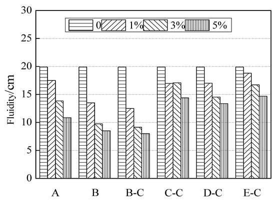 The fluidity of the cement mortar was measured immediately after it had been mixed, and the results are shown in Figure 10. It is observed that the fluidity of the cement mortar mixed with NAC decreased with the increase in the mixing amount. When the mixing amount of uncalcined raw ore and high-viscosity ore was at 5%, the fluidity of the cement mortar was reduced by 45.23% and 57.27%, respectively. This is in comparison to the fluidity of the ordinary specimens. Hence, the fluidity is greatly reduced, which will, in turn, seriously affect the workability of the cement-based materials. This can be explained by two reasons. Firstly, owing to the strong hygroscopicity and colloidality of the NAC, the original water in the cement void was adsorbed by the pores of the NAC rod-like crystals, which then decreased the water–binder ratio and made the mortar viscous, particularly for its colloidality. Secondly, the microstructures of the NAC possessed a great amount of chaotic fibrous rod-like crystal structures, which aggregated into a mass in an extremely easy manner. When they were mixed with the cement mortar, the internal friction resistance was increased so as to decrease fluidity. The figure also reveals that, for the high-viscosity ore specimen after ultrasonic dispersion, the fluidity of its cement mortar was relatively lower than that of the high-viscosity ore without ultrasonic dispersion. This was mainly because the fibrous rod-like crystal mass of the NAC was unfolded by the ultrasonic dispersion and its specific surface area was enlarged. Therefore, the fibers were increased, and both the hygroscopicity and internal friction resistance were strengthened, thus reducing the fluidity of the cement mortar. It can also be seen in the figure that the fluidity of the cement mortar mixed with calcined NAC was prominently greater than that of the cement mortar mixed with uncalcined NAC. In addition, the fluidity was enhanced with the increase in calcination temperature, as derived by the fact that the fluidity of the cement mortar mixed with calcined high-viscosity ore (namely D and E) at a mixing amount of 5% was reduced by 32.66% and 26.13%, respectively, in comparison to the ordinary specimens. The major cause was that the decrease in colloidality of calcined NAC was much larger than the increase in its adsorbability. Consequently, parts of the rod-like crystals were broken and collapsed, the seamed edges became sleeker, and the internal friction resistance was smaller than that of uncalcined NAC.