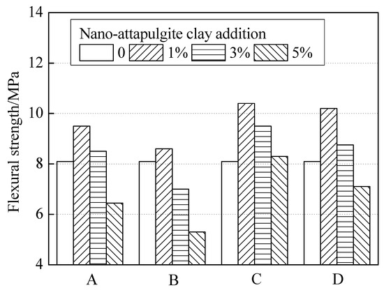 It can be found in Figure 11 that the four types of NAC possessed the greatest flexural strength at a mixing amount of 1%, and that the flexural strength gradually declined as the mixing amount increased. The flexural strength of the cement paste mixed with calcined raw ore and high-viscosity ore at a mixing amount of 1% was generally improved by 28.40% and 17.28%, respectively, when compared to that of the cement without NAC. It was discovered in the test that the addition of a small amount of uncalcined NAC could improve the workability of the cement paste. However, with the increase in the mixing amount, the fluidity of the paste was increasingly poorer. As such, it was difficult for the paste to vibrate and compact, resulting in the introduction of a large number of pores, which were most obvious in the high-viscosity ore. As a natural mineral, uncalcined NAC is characterized by a relatively stable chemical property. Therefore, when it was added into the cement paste, it existed as an impurity such that hydration could hardly be activated. The activity of the calcined NAC was also raised substantially. Moreover, the colloidality of the NAC was reduced through high-temperature calcination, thereby decreasing the influence on the workability of the cement paste.