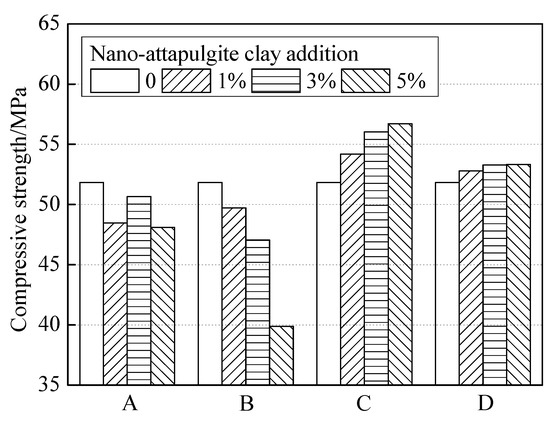 The compressive strength test was carried out when the specimens were cured to an age of 28 d, and the results are shown in Figure 12. It reveals that the compressive strength of the cement paste was reduced by the addition of uncalcined NAC, and the decrease in the compressive strength of the cement paste mixed with high-viscosity ore was especially significant as the mixing amount increased. The compressive strength of calcined raw ore cement with a 1%, 3%, and 5% content is 6.5%, 2.29%, and 7.25% lower than that of the cement without NAC; the strength of calcined high-clay cement with a 1%, 3%, and 5% content is 4.11%, 9.25%, and 2.31% lower than that of the cement without NAC. This was because, on the one hand, uncalcined NAC’s comparatively significant impact on the cement paste’s fluidity lowered the matrix’s compactness. On the other hand, uncalcined NAC existed in the cement paste as an impurity because its low activity made it difficult for it to participate in the hydration. Consequently, the compressive strength of the cement paste mixed with calcined NAC was remarkably improved as the mixing amount increased. In the test, the compressive strength of calcined raw ore cement with a 1%, 3%, and 5% content is 4.5%, 8.06%, and 9.38% higher than that of the cement without NAC; the strength of calcined NAC high-clay cement with a 1%, 3%, and 5% content is 1.84%, 2.76%, and 2.86% higher than that of the cement without NAC.