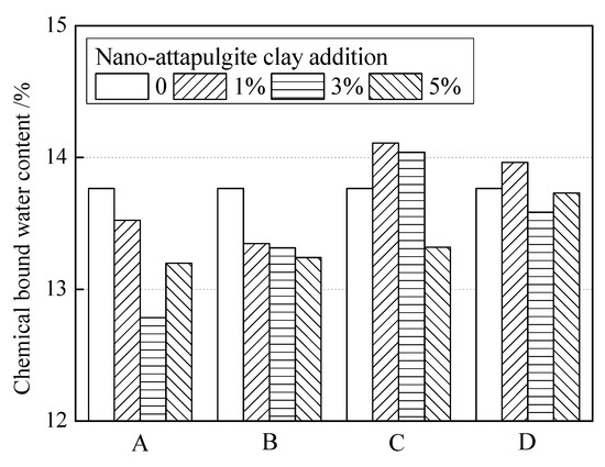 The chemical-binding water content of cement paste with various NAC addition is shown in Figure 13. From Figure 13, we can draw that the addition of uncalcined NAC decreased the chemical immobilized water content of the paste, thereby presenting a low degree of hydration. In addition, because of its strong hygroscopicity, uncalcined NAC adsorbed plenty of free water into its fibrous rod-like crystals and reduced the water–binder ratio around the cement particles. Adding calcined NAC can improve the hydration degree of slurry. When adding 1% and 3% calcined NAC raw ore, the chemical-bound water content of cement is 2.5% and 1.99% higher than cement without NAC. The chemical and chemical-bound water content of the cement with 1% NAC is 1.43% higher than that of cement without NAC. This is mainly because calcined NAC’s colloidal and adsorption properties are reduced, but the chemical activity is significantly enhanced. It no longer exists in the slurry as impurities but directly participates in the hydration process.