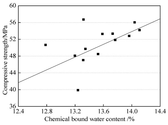 Figure 14 shows the relationship between the compressive strength of the cement paste and the chemically immobilized water content, which was positively correlated. This indicated that the addition of calcined NAC could raise the hydration degree of the cement paste, thus improving its compressive strength.