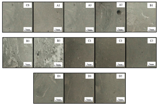 From Figure 15, it can be observed that the visible pores of the cement paste mixed with calcined NAC were notably fewer than those of the cement paste mixed with uncalcined NAC and those of the cement paste without NAC. There was a notable number of visible pores in the fracture section of the cement paste mixed with uncalcined NAC raw ore, and the number and the diameter of the pores grew as the mixing amount increased; when the mixing amount reached 5%, visible pores with a diameter of approximately 4 mm appeared. A large number of visible pores emerged in the fracture section of the cement paste mixed with uncalcined NAC high-viscosity ore at a mixing amount of 3%, and the pore diameter stood at around 1 mm. The mixing amount reached 5%, and there were massive irregular pores in the fracture section of the cement paste. The content of visible pores in the fracture section of the cement paste that prominently improved by adding the calcined NAC was remarkably reduced, with only a few pores observable by the naked eye. We can draw that the calcined NAC has the potential to enhance the compactness of the cement paste.