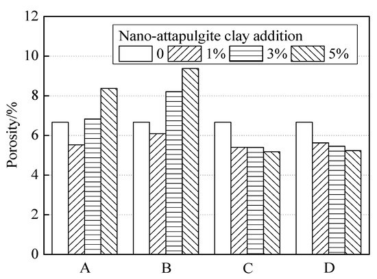 From Figure 16, it can be drawn that adding 3% and 5% uncalculated NAC can reduce the compactness of hardened cement paste and increase the porosity. The porosity of cement mixed with 3% and 5% uncalculated NAC raw ore is 2.44% and 25.58% higher than that of the cement without NAC. The porosity of cement mixed with 3% and 5% uncalculated NAC high-viscosity mineral is 23.07% and 40.62% higher than that of the cement without NAC. This indicated that an uncalculated high-viscosity mineral is not conducive to forming dense hardened cement. Adding calcined NAC can effectively reduce the porosity of hardened cement and improve the compactness, which is consistent with the conclusion in Figure 15. The porosity of hardened cement with 1%, 3%, and 5% NACis 19%, 19.04%, and 22.27% lower than that of the cement without NAC. When the content of NAC with high viscosity is 1%, 3%, and 5%, the porosity of hardened cement paste is 15.58%, 18.1%, and 21.46% lower than that of the cement without NAC, which indicates that calcined NAC raw ore has the best effect in improving the compactness of hardened cement paste. The effect is the best when the content is 5%.