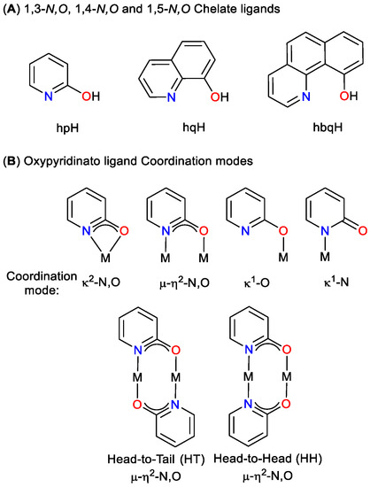 Figure 2. Overview of the N,O donor pro-ligands, hpH, hqH, and hbqH used in this study (A), and the common coordination modes observed for the 2-hydroxpyridinato (hp) ligand (B).