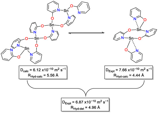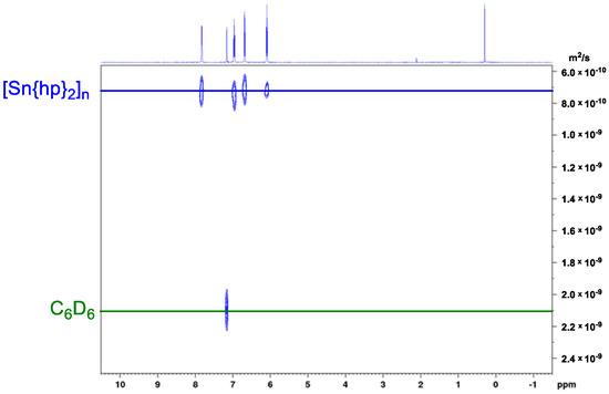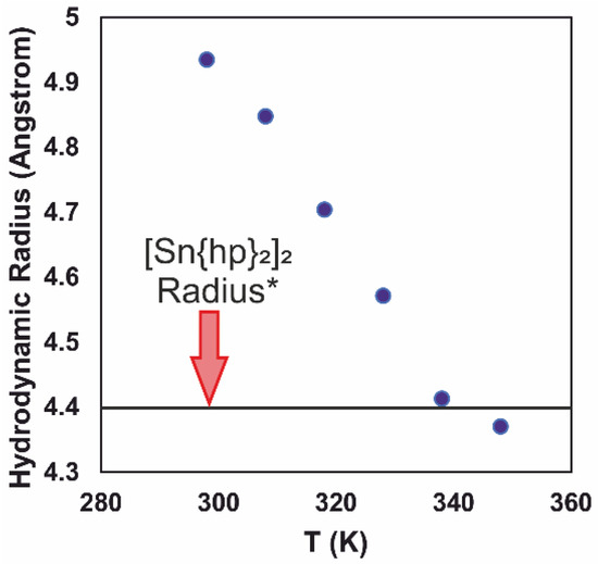 Using Stalke’s method, and correcting empirically for molecular density (using an empirically determined density correction factor of 1.5535 and hence accounting for the heavy Sn atom) [78], we predict a molecular mass of 937 Da (c.f. a calculated mass for a trimeric species [Sn{hp}2]3 of 921 Da, 2% error). To test our hypothesis, 1H DOSY NMR experiments were undertaken at regular intervals between 298 K–348 K. Table 1 and Figure 4 show the diffusion coefficients of 2, 5.43 mM in d8-Tol as a function of temperature. At 298 K, 1H DOSY NMR affords an experimentally determined diffusion coefficient of D = 7.97 × 10−10 m2 s−1, which on warming to 348 K increases to D = 1.75 × 10−9 m2 s−1. The observed change in the calculated hydrodynamic radii is concomitant with a decrease in the calculated hydrodynamic radii, such that at 348 K RHyd-cal = 4.37 Å (cf. RHyd-cal = 4.93 Å at 298 K and a crystal graphically determined R = 4.44 Å) consistent with a tetramer ⇄ dimer equilibria which lies towards the dimeric species at higher temperatures. When cooled to room temperature, the observed diffusion coefficient returns to D = 7.97 × 10−10 m2 s−1, implying a low barrier to tetramer formation.