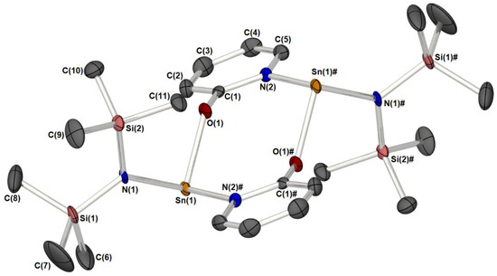 Both the oxygen and nitrogen donor atoms of the oxypyridinato ligands bridge the two transoidal Sn{N(SiMe3)2} moieties in a head-to-tail (HT) μ-η2 coordination mode, resulting in an eight-membered Sn2O2C2N2 cyclic core to the molecule.