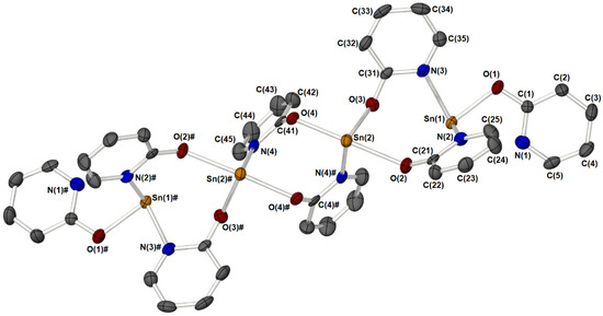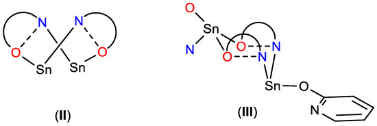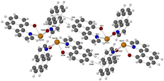 The Sn–O and Sn–N bond lengths within the eight-membered ring [Sn(1)-O(2) 2.1491(14), Sn(1)-N(2) 2.2751(19), and Sn(2)-O(2) 2.1434(15), Sn(2)-N(4) 2.2590(19) Å] are shorter than the range expected for simple Sn ← O and Sn ← N Lewis acid–base complexes [9,51,81,82,83]. Although the pyridine rings are stacked in the crystal lattice in an antiparallel-displaced arrangement, the inter-ring distance (>4 Å) is greater than that expected for any significant electronic interaction (i.e., 3.4 Å) [84].