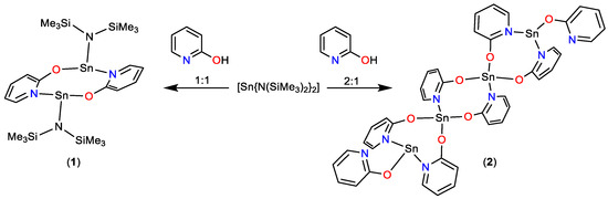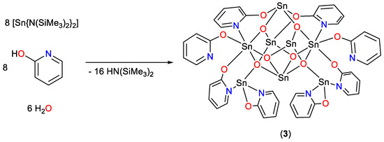 During our investigation into the synthesis of complex 2, crystals of a second product, 3, were serendipitously isolated from the reaction liquors. Unfortunately, the low yield of the product inhibited full characterisation. Attempts to produce crystals of 3 on a larger scale, either by a controlled reaction of [Sn{N(SiMe3)2}2] with 2-hydroxypyridine and water, as shown in Scheme 3, or by the slow (4 weeks) diffusion of air and atmospheric moisture into a solution of 2 in toluene at room temperature, failed [80].