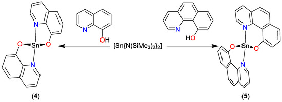 The reaction of [Sn{N(SiMe3)2}2] with equimolar amounts of the ligands 8-hydroxyquinoline and 10-hydroxybenzo[h]quinoline, respectively (Scheme 4), results in the formation of the bis-quinolinato complexes, 45, in yields < 50%, suggestive of an equilibrium in which the putative mono-amide intermediates are unstable with respect to disproportionation, and formation of the bis-complex.
