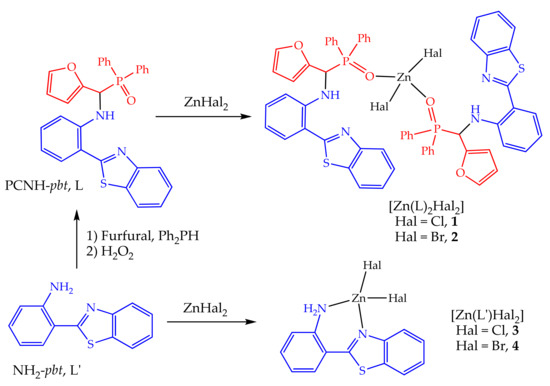 1,3-Aminophosphine PCNH-pbt was synthesized from NH2-pbt using the phospha-Mannich reaction as reported recently [22]. Interaction between ZnHal2 (Hal = Cl and Br) and PCNH-pbt in ethyl acetate results in precipitation of compounds [Zn(L)2Hal2] (1 and 2, correspondingly; Scheme 1). The use of a stoichiometric ratio of the reagents (1:2) results in a mixture of solid phases. According to powder XRD analysis (Figures S1 and S2), the mixture consists of the title products and PCNH-pbt in a molar ratio of 55/45% for compound 1 and 40/60% for 2. The phases exhibit approximately equal solubility in common organic solvents, which does not allow us to separate compounds 1 and 2 from free PCNH-pbt by a washing procedure. Pure phases 1 and 2 were obtained in the reactions with an excess of ZnHal2, i.e., at a molar ratio of the reagents of ca. 1:1 (Figures S3 and S4). For comparison, we performed reactions between archetypal NH2-pbt and ZnHal2 to give [Zn(L’)Hal2] (Hal = Cl, 3 and Hal = Br, 4). The compounds under study were characterized by single crystal and powder XRD analysis and IR spectroscopy. Crystals of 1 suitable for single crystal XRD can be prepared by a concentration of the mother liquor, while compound 2 is formed as a fine powder; its isostructurality with 1 has been determined by powder XRD analysis (Figure S4). Once solids 1 and 2 precipitate from the mother liquor, they become poorly soluble in organic solvents, which does not allow us to study them by means of NMR spectroscopy. In highly polar solvents, the compounds likely dissociate, and thus we did not study their photophysical properties in the solution.