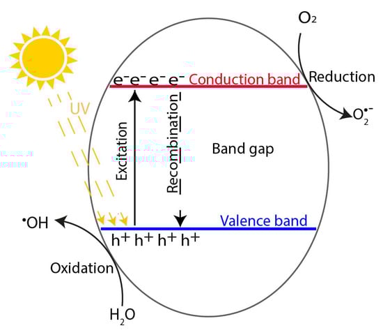 The semiconductor-assisted photoreaction mechanism responsible for the abatement of most of the pollutants by oxidation upon irradiation with UV or visible light can be generally described by some peculiar basic mechanisms. The most important underlying reactions are schematically shown in Figure 1 and have been described in detail in other reviews (e.g., in Refs. [34,35,36]). If a photosemiconductor is radiated with energy equal or higher than the energy of the band gap, an electron is excited from the valence band (VB) into the conduction band (CB) (Equation (1)).