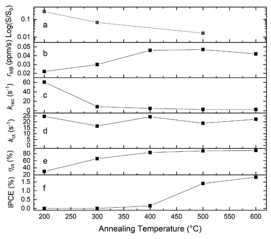 Comparison of photocatalytic and photoelectrochemical parameters of TiO films annealed at different temperatures on FTO glass under UV-A irradiation: (a) E. coli survival rate after 60 min irradiation (please note, that the data point at “200 C” denotes here an uncoated glass reference sample), (b) methylene blue degradation rate, (c) charge carrier recombination rate, (d) charge transfer rate, (e) charge transfer efficiency, and (f) photoquantum yield IPCE (incident photon conversion efficiency). The electrochemical parameters were determined at a potential of approximately −0.6 VAg/AgCl. (Reprinted/adapted with permission from Ref. [44]). More information can be found in Ref. [27].