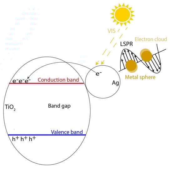 The absorption of longer wavelengths due to noble metal doping is usually associated with the effect of surface plasmon resonance. Surface plasmons are caused by a collective oscillation of free charge carriers on the surface of conducting materials upon interaction with light (Figure 3). Resonance occurs when the particles are irradiated with light corresponding to their plasmon frequency, resulting in induced electric fields on the surface of the particles. Regarding the generated electric fields, it was shown that the generated electric fields can lead to a one thousand times larger charge carrier formation compared to the incident electric field. The plasmon frequency can be highly influenced and depends on factors such as nanoparticle material, size, and shape [72].