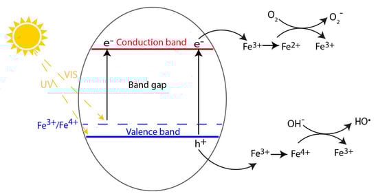 Energy diagram for doping with iron and possible consecutive reaction mechanisms under UV and visible light irradiation.