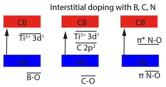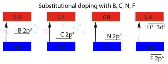 Doping with non-metals has mainly been carried out with N, S, C, and B [75,76,77,78,79]. The resulting properties vary depending on whether the non-metals are substitutional for oxygen or are incorporated as interstitial atoms. It is assumed that the substitution of oxygen mainly affects the valence band, which is built of O 2p states, yet there seem to be exceptions such as doping with fluorine. Here, the excess electron is lifted into the empty titanium levels and trapped in the Ti 3d orbital, which lies below the conduction band. Doping with lighter elements than oxygen such as N, C, and B causes the valence band to be depleted by one to three electrons depending on which element was used. It can be seen that the lower the atomic number, the higher the energy of the 2p levels. Figure 5 shows that the energy of the 2p states is increasing in the order of N, C, and B. The B 2p state has the highest energy level which leads to a smaller band gap [75].