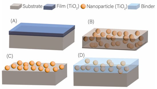 Multiple ways for preparation of titania at surfaces: Homogeneous TiO2 film (A), titania nanoparticles suspended in substrate (B), titania nanoparticles directly applied to the surface (C), and titania nanoparticles in a coating layer (D).