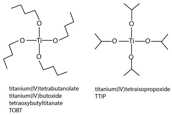 Rodrigues-Silva et al. synthesized a sol, aged it to a gel, which they then diluted and immersed in cellulose acetate monoliths [97]. For the synthesis, they used just titanium butoxide TOBT (Figure 8), ethanol, water and acetic acid. An anatase morphology was obtained.