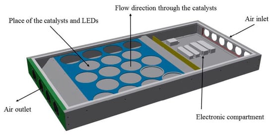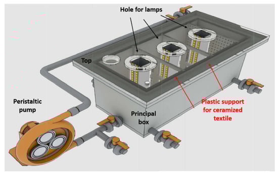 - Abou Saoud, W.; Kane, A.; le Cann, P.; Gérard, A.; Lamaa, L.; Peruchon, L.; Brochier, C.; Bouzaza, A.; Wolbert, D.; Assadi, A.A. Innovative photocatalytic reactor for the degradation of VOCs and microorganism under simulated indoor air conditions: Cu-Ag/TiO2-based optical fibers at a pilot scale. Chem. Eng. J. 2021, 411, 128622. [Google Scholar] [CrossRef]