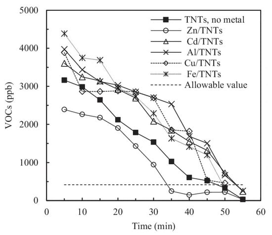 Thuy et al. impregnated titania nanotubes for air purification with different metals [88]. For this purpose, P25 was dispersed in sodium hydroxide solution for 20 min. This was followed by hydrothermal treatment at 135 °C for 24 h in an autoclave. After filtration and dispersion in nitric acid, the product was separated and purified with water. It was then dried and annealed at 500 °C. The synthesis was based on a protocol published by Nguyen et al. [105]. Before annealing, the basis for modification was established via impregnation with various metal salts, namely Zn(NO3)2, Cd(NO3)2, Al(NO3)3, Cu(NO3)2 and Fe(NO3)3. Impregnation of fibreglass was then carried out with the photocatalyst dispersed in water.