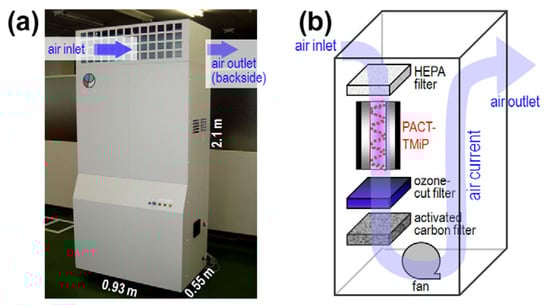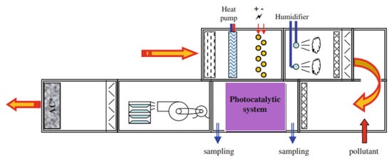 - Ochiai, T.; Hayashi, Y.; Ito, M.; Nakata, K.; Murakami, T.; Morito, Y.; Fujishima, A. An effective method for a separation of smoking area by using novel photocatalysis-plasma synergistic air-cleaner. Chem. Eng. J. 2012, 209, 313–317. [Google Scholar] [CrossRef]