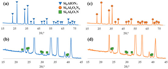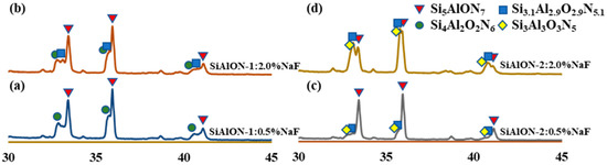 Characteristic parts of XRD patterns of the SiAlON:NaF samples after sintering: (a) SiAlON-1:0.5%NaF; (b) SiAlON-1:2.0%NaF; (c) SiAlON-2:0.5%NaF; (d) SiAlON-2:2.0%NaF (the full XRD patterns can be found in the Supplementary Materials).