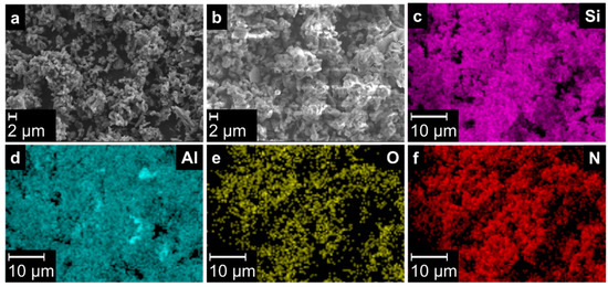 SEM-images of the samples SiAlON-1 (a) and SiAlON-2 (b) and element mapping with EDX spectroscopy for the sample SiAlON-1 (c–f).