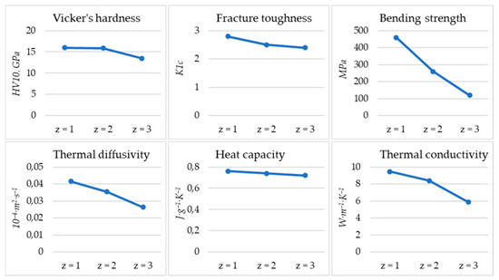 So, both the XRD and SEM/EDX data confirmed the formation of β-SiAlONs with lower Si/Al ratios (i.e., a higher z value) in the sintered samples compared to the starting materials. Many mechanical and physical properties of β-SiAlONs are known to be affected by z value, e.g., hardness, toughness, bending strength, thermal diffusivity, heat capacity, and thermal conductivity [24,41,42]. Mainly, an increase in z has a rather negative impact on the mechanical properties (Figure 6). However, if thermal conductivity is considered, it decreased with an increase in the z value, which is good when thermal insulative capability is in focus. In addition, an important point is that full-density ceramics are usually higher in the properties listed above, and the addition of fluorides is helpful for structural densification of β-SiAlONs. It is quite interesting that for the SiAlON-2:0.5%NaF sample formation, almost a single phase of Si5AlON7 was observed with a noticeably higher density compared to the initial Si5AlON7 (3.11 g∙cm–3 vs. 3.04 g∙cm–3). That indicates a possible practical pathway not only for the transformation of different types of β-SiAlON into each other but also for the preparation of high-density ceramics by presureless sintering at relatively low temperatures (compared to the traditionally used range of 1700–1850 °C) and without the incorporation of large amounts of fluorine. The latter is rather important if the material is used as a refractory, because, by decreasing the glass transition temperature and melting temperature, fluorine may have a negative impact on the high-temperature refractory performance [33].