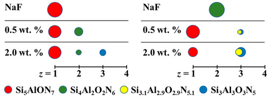 To date, this is the first detailed study of the phase transformations occurring in β-SiAlONs in the presence of a small addition of alkali metal fluoride at high temperatures. In contrast to some previous studies, it dealt with the processes in the volume of the materials, not only on the surface [34,37]. The general revealed trend was a formation of phases with a lower Si/Al ratio (or higher z value). In parallel, structural densification also took place, which may counterbalance the decrease in mechanical properties, which usually happens when the z value increases. The sintered samples did not show a noticeable content of fluorine, so a lesser impact on the refractory properties may be expected in contrast to ceramics with high loading of fluorine [33]. Finally, the almost quantitative transformation of Si4Al2O2N6 into Si5AlON5 in the presence of 0.5 wt.% of NaF accompanied with densification by ~2% seems to be perspective pathway to produce high-density ceramics from lower quality materials.