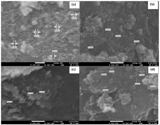 SEM results of the prepared (a) Al2O3 nanoparticles; (b–d) Al2O3 doped by CuO NiO, and CoO, respectively.