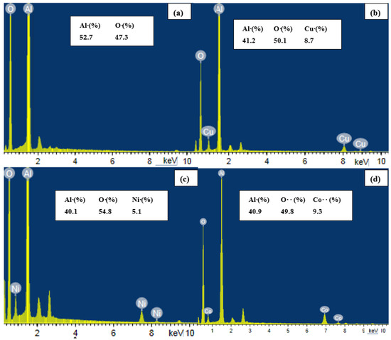 EDX results of the prepared (a) Al2O3 nanoparticles, (b–d) Al2O3 doped by CuO, NiO, and CoO, respectively.
