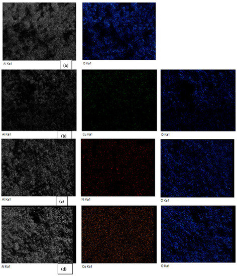 EDX mapping for the (a) Al2O3 nanoparticles, (b) Al2O3—CuO, (c) Al2O3—NiO, and (d) Al2O3—CoO nanocomposites.