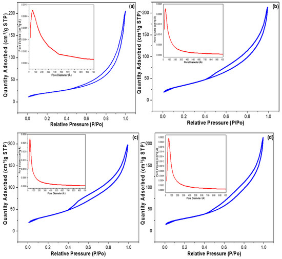 The nitrogen adsorption isotherms and pore size distribution results for (a) Al2O3 nanoparticle, (b) Al2O3-CuO, (c) Al2O3-NiO, and (d) Al2O3-CoO nanocomposites.
