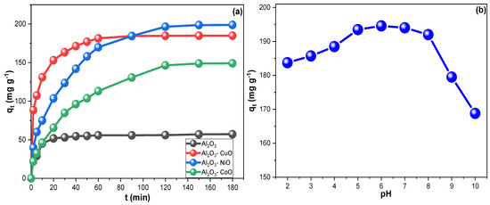 The contact-time impact on IGC adsorption on Al2O3, Al2O3-CuO, Al2O3-NiO, and Al2O3-CoO were presented in Figure 7a. Although the adsorption equilibrium was not reached for all sorbents until three hours, almost 90% of the total uptakes were taken within the first 60 min. The obtained qt values for Al2O3, Al2O3-CuO, Al2O3-NiO, and Al2O3-CoO were 57.2, 184.9, 198.8, and 149.1 mg g−1, respectively. These findings aligned with the high surface area revealed by the BET analysis for Al2O3-NiO nanocomposite, so it was selected for further investigations.
