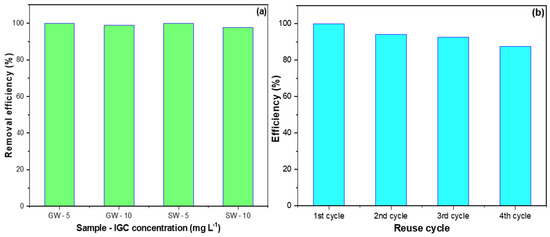 Figure 11a shows the results of using Al2O3-NiO nanocomposite for removing IGC from synthetically contaminated SW and GW. The nanocomposite possessed an average efficiency of 99.2% in treating the 5 and 10 mg L−1 IGC concentrations in each SW and GW sample. It is worth mentioning that the SW and GW polluted by 5.0 mg L−1 IGC concentrations were fully remediated. The lowest removal efficiency of 97.6 was attained with SW, which can be attributed to its high ion content.