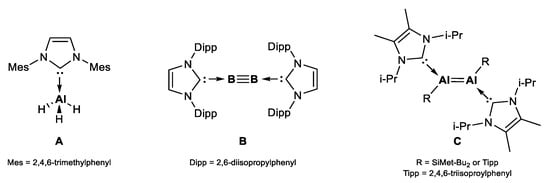 In regard to NHC-stabilised group 13 complexes, those involving aluminium are the least well-studied to date, which is surprising given its high natural abundance and low cost, making aluminium a desirable metal to work with. In addition, the high stability and Lewis acidity of Al(III) trialkyl and trihalide derivatives have led to them being widely used in Zieglar-Natta and Friedel-Crafts reactions, respectively [,]. Furthermore, recent studies have shown the developing role of ligated aluminium-hydrides in hydroelementation and dehydrocoupling catalysis [,,,,,,], as well as the use of commercially available Al-H containing species such as LiAlH4 and DIBAL-H for hydrogenation and hydroboration catalysis [,,].