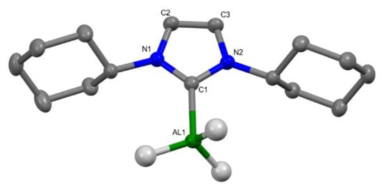 SC-XRD quality crystals were obtained from a concentrated toluene solution at −25 °C and the solid-state structure is shown in Figure 4. Similar to compound 1, the two cyclohexyl substituents are close to perpendicular to the imidazole ring. The Al-C bond length of 2.055(11) Å is comparable to previously reported NHC-alanes (A, D–G) [,,,,].