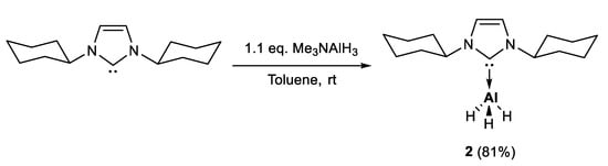 - Schmitt, A.L.; Schnee, G.; Welter, R.; Dagorne, S. Unusual reactivity in organoaluminium and NHC chemistry: Deprotonation of AlMe3 by an NHC moiety involving the formation of a sterically bulky NHC–AlMe3 Lewis adduct. Chem. Commun. 2010, 46, 2480–2482. [Google Scholar] [CrossRef] [PubMed]